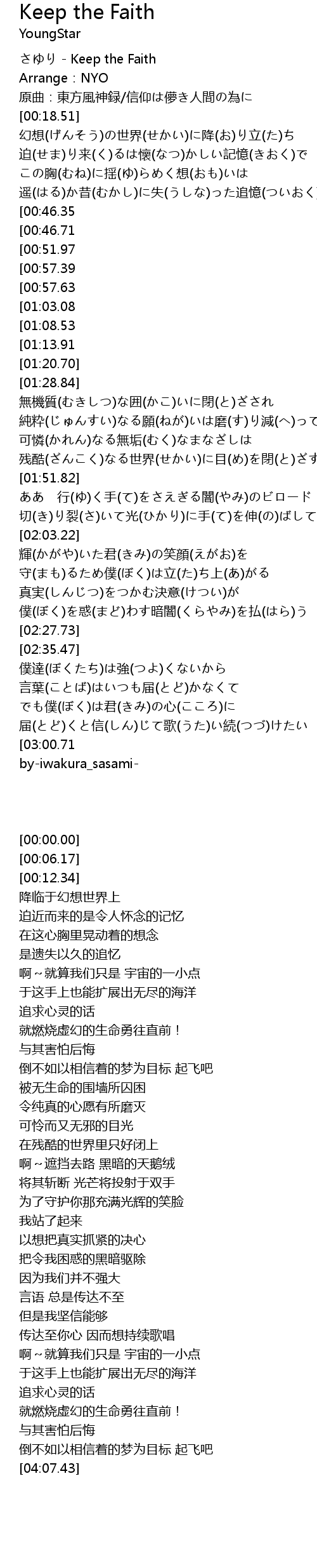 | [00:12.34] | 原曲:東方風神録/信仰は儚き人間の為に |