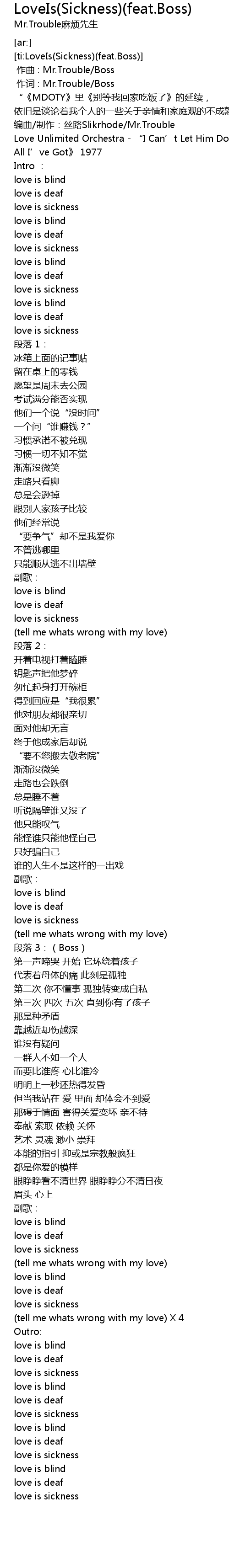 | [ti:LoveIs(Sickness)(feat.Boss)] | |
