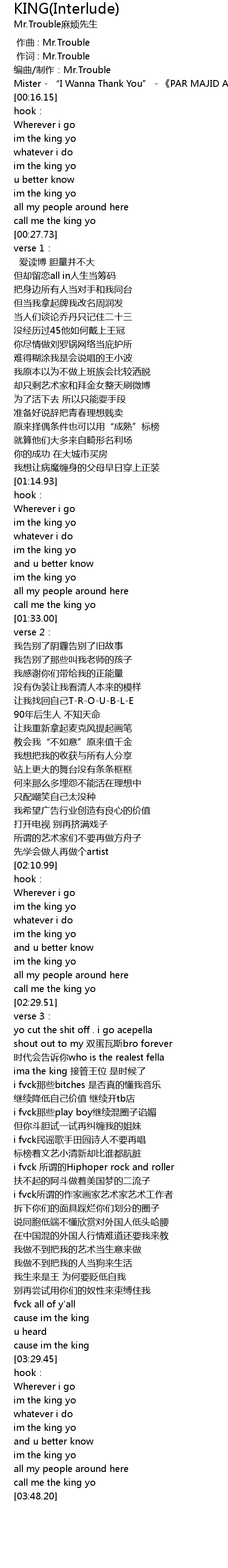 | [00:01.00] | 作词 : Mr.Trouble |