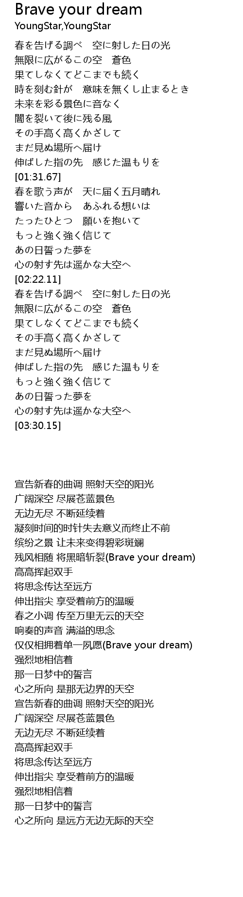 | [03:20.22] | 心の射す先は遥かな大空へ |