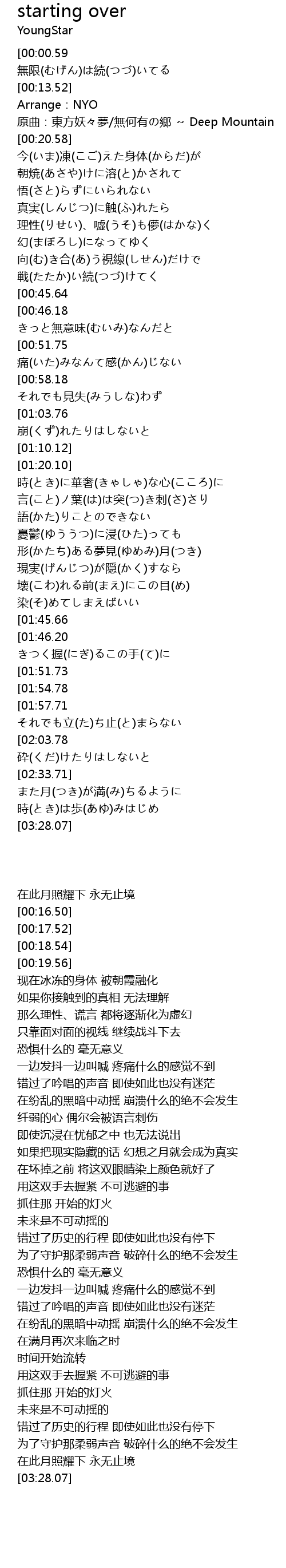 | [00:19.56] | 原曲:東方妖々夢/無何有の郷 ~ Deep Mountain |