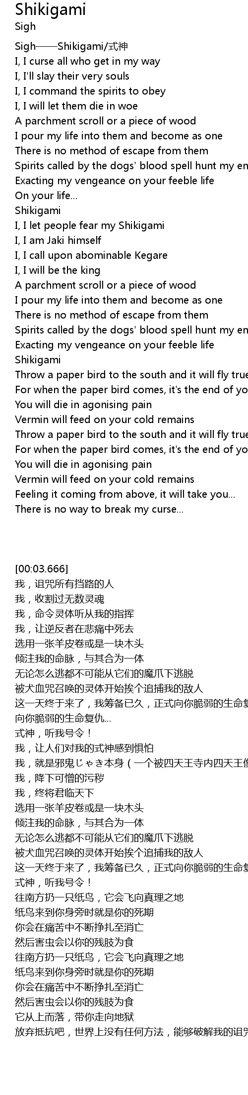 | [00:03.666] | Sigh——Shikigami/式神 |