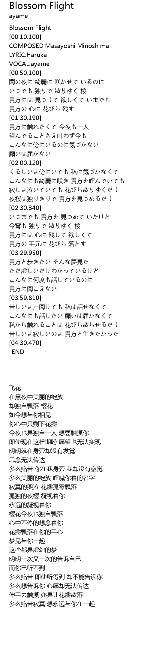 | [03:07.890] | 今宵も 独りで 散りゆく 桜 |