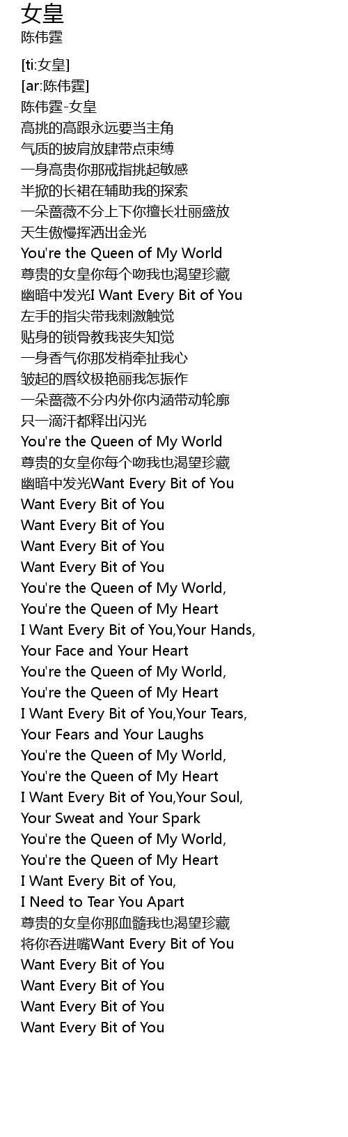 | [02:14.332] | 尊贵的女皇你每个吻我也渴望珍藏 |