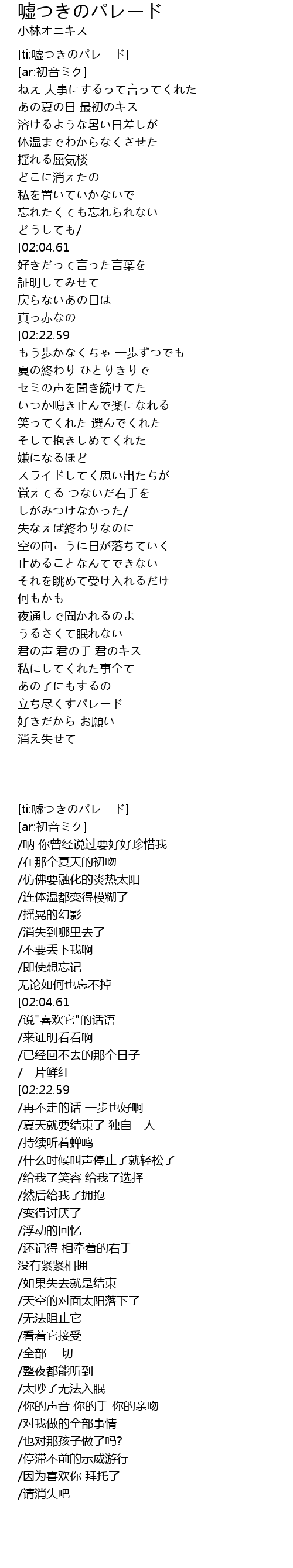 | [00:57.57][02:04.61][03:11.83] | 嘘つきのパレード |