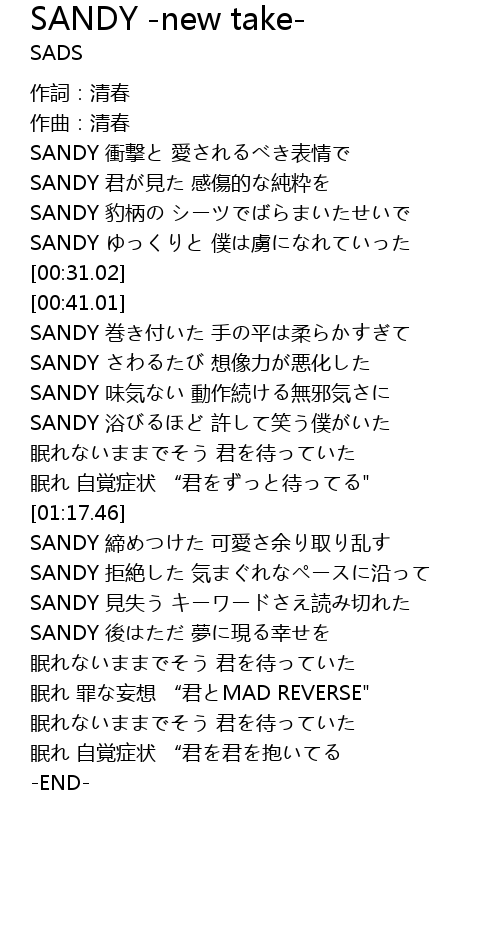| [00:56.20] | SANDY 味気ない 動作続ける無邪気さに |