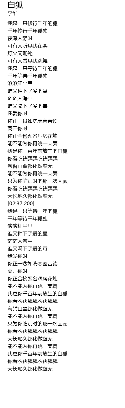 | [03:55.400] | 我是你千百年前放生的白狐 |