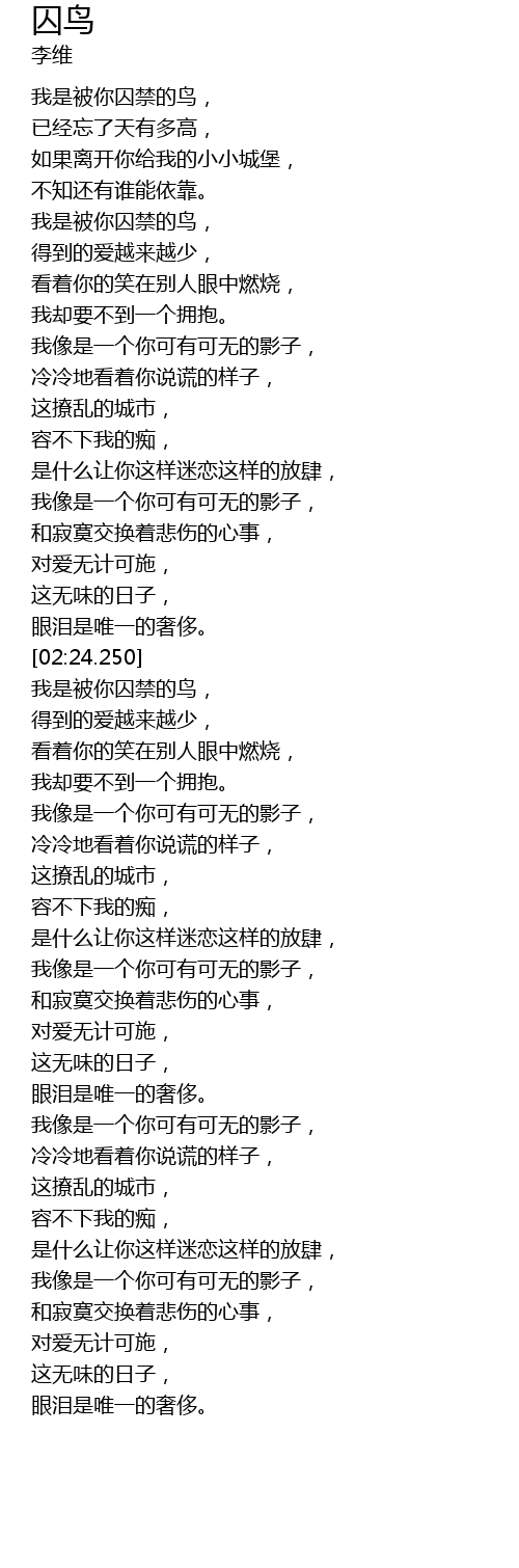 | [02:40.450] | 我是被你囚禁的鸟, |
