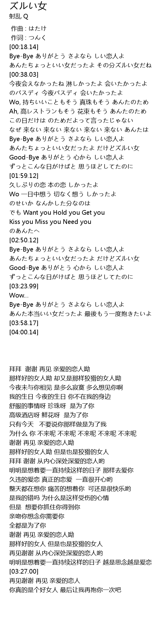 | [01:33.74] | あんたちょっといい女だったよ だけどズルい女 |