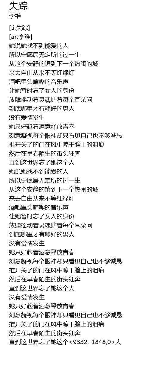| [03:47.901] | 直到这世界忘了她这个<9332,-1848,0>人 |