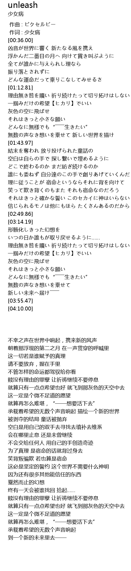 | [03:46.61] | 無数の声なき想いを乗せて 新しい未来へ届け―――― |