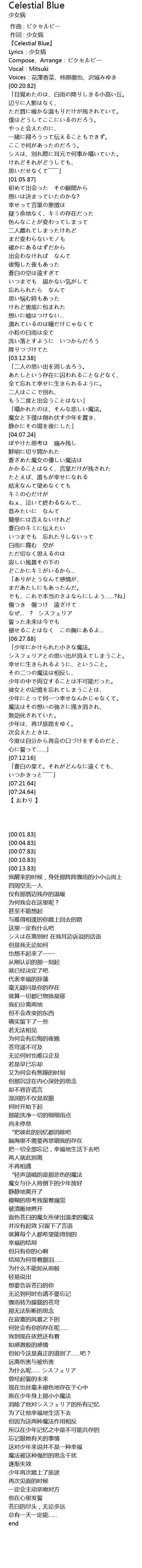 | [00:13.83] | Voices:花澤香菜、柿原徹也、沢城みゆき |