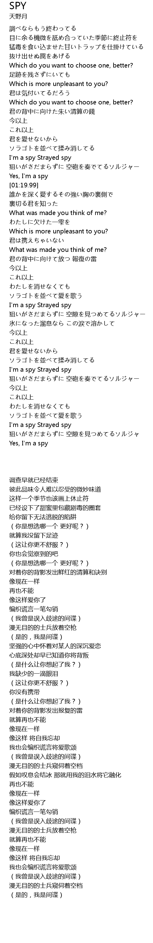 | [01:07.40] | I' m a spy Strayed spy |