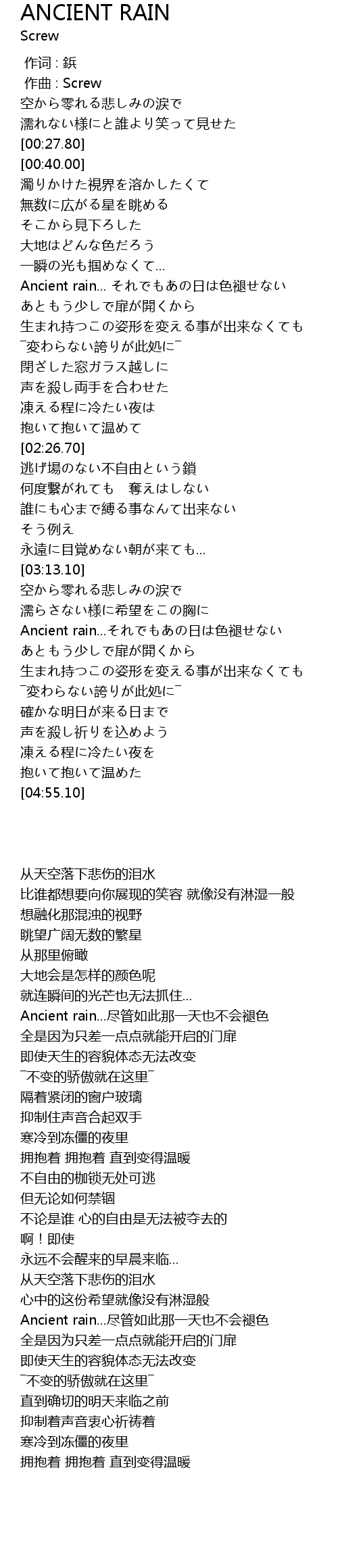 | [03:55.25] | Ancient rain... rì sè tuì |