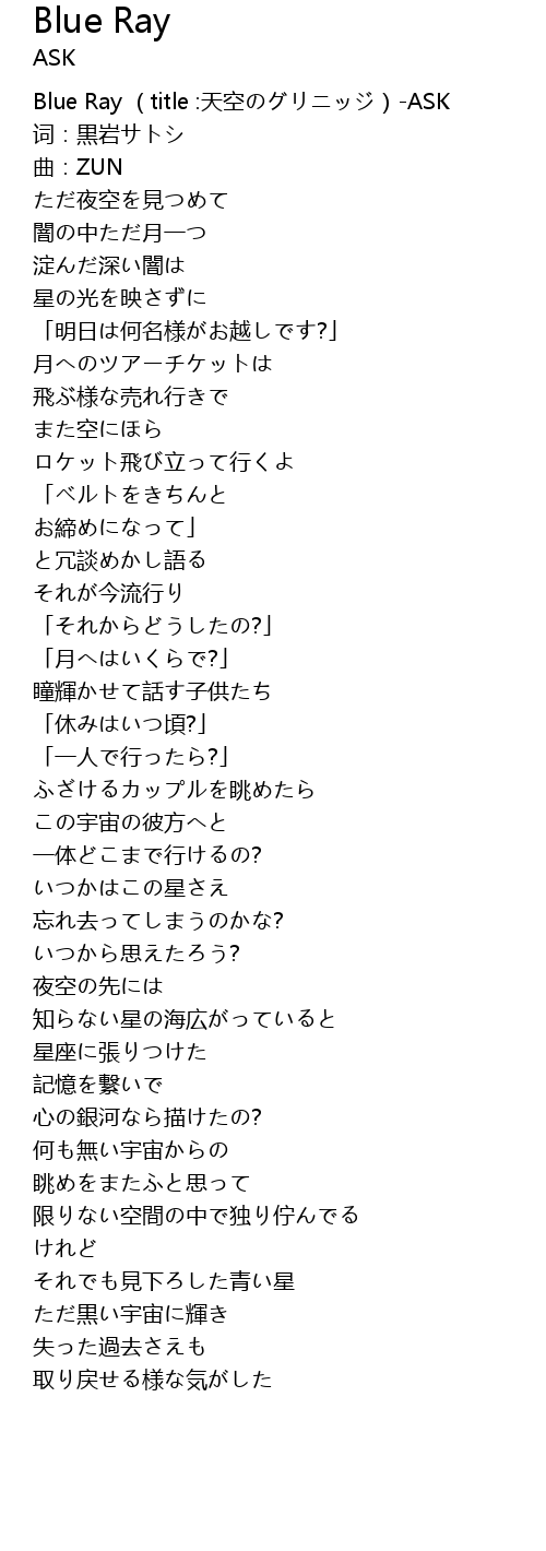 | [00:00.00] | Blue Ray (title :天空のグリニッジ)-ASK |