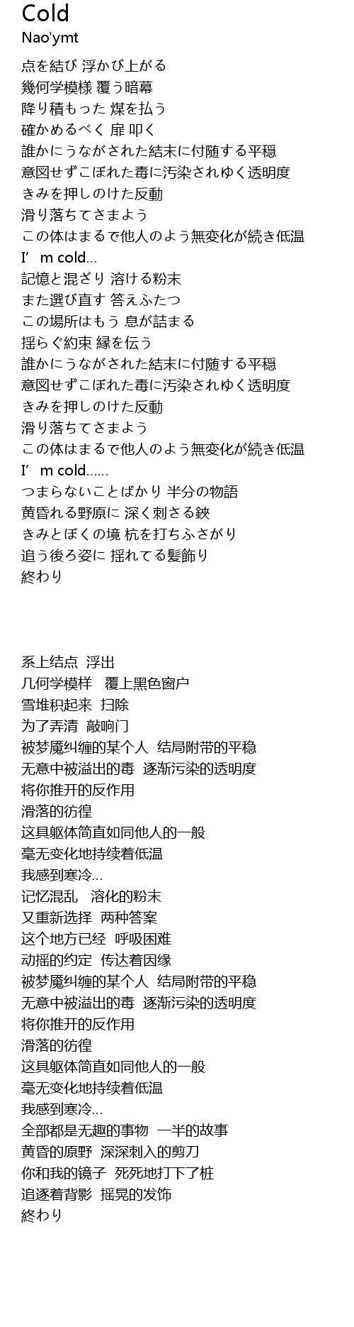 | [01:13.59] | この体はまるで他人のよう無変化が続き低温 |