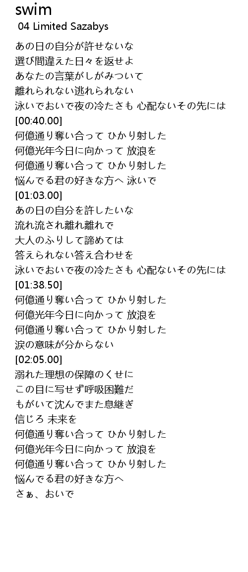 | [00:28.50] | 泳いでおいで夜の冷たさも 心配ないその先には |