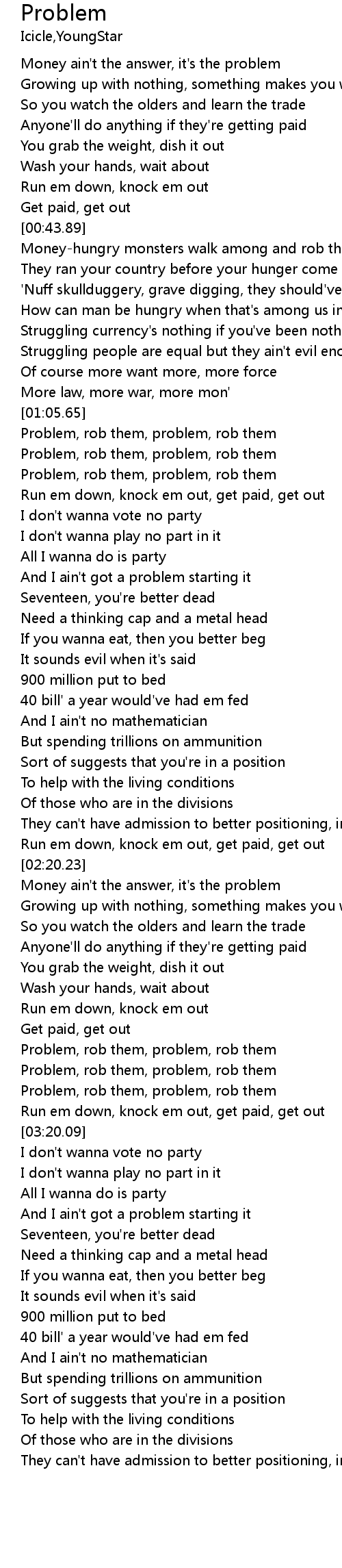 | [00:23.02] | Money ain't the answer, it's the problem |