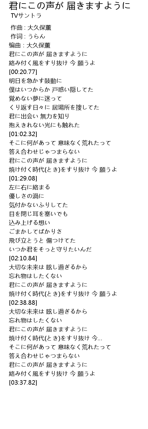 | [03:22.94] | 君にこの声が 届きますように |