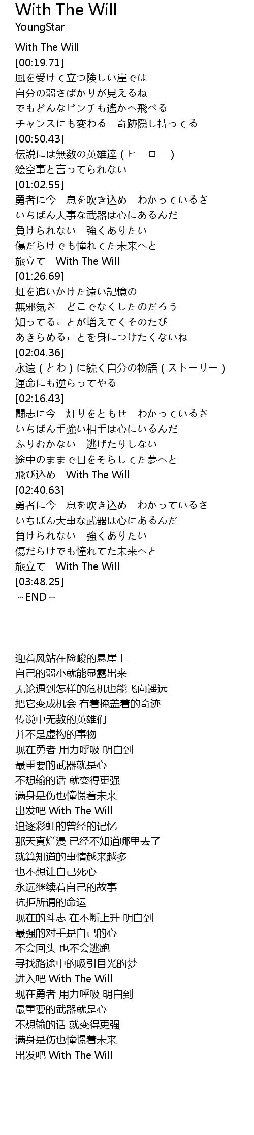 | [02:23.53] | いちばん手強い相手は心にいるんだ |