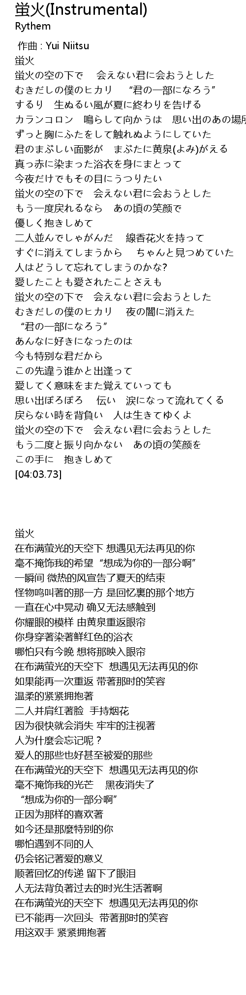 | [03:42.44] | 蛍火の空の下で 会えない君に会おうとした |