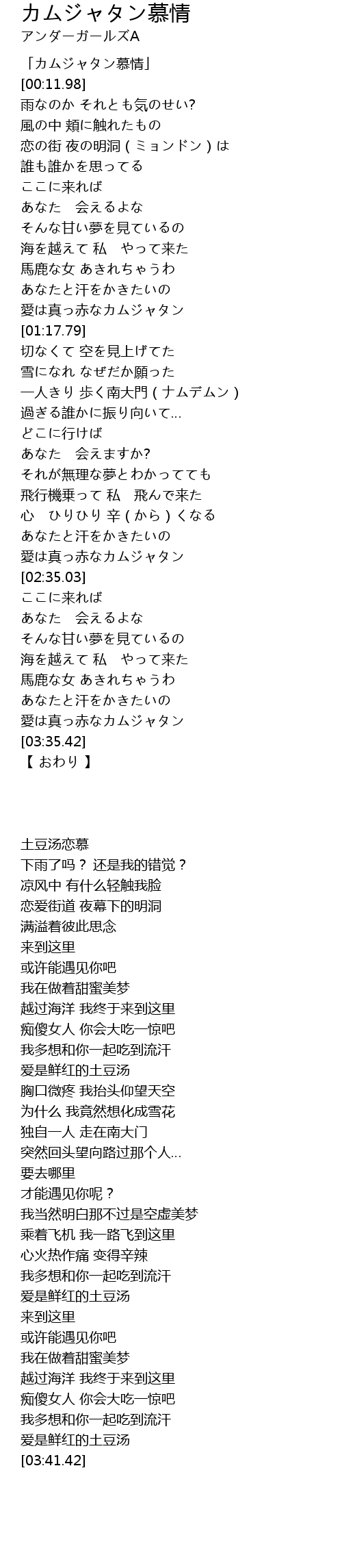 | [01:11.04] | 愛は真っ赤なカムジャタン |