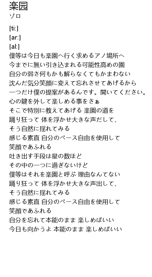 | [00:29.44] | 僕等は今日も楽園へ行く求めるアノ場所へ |