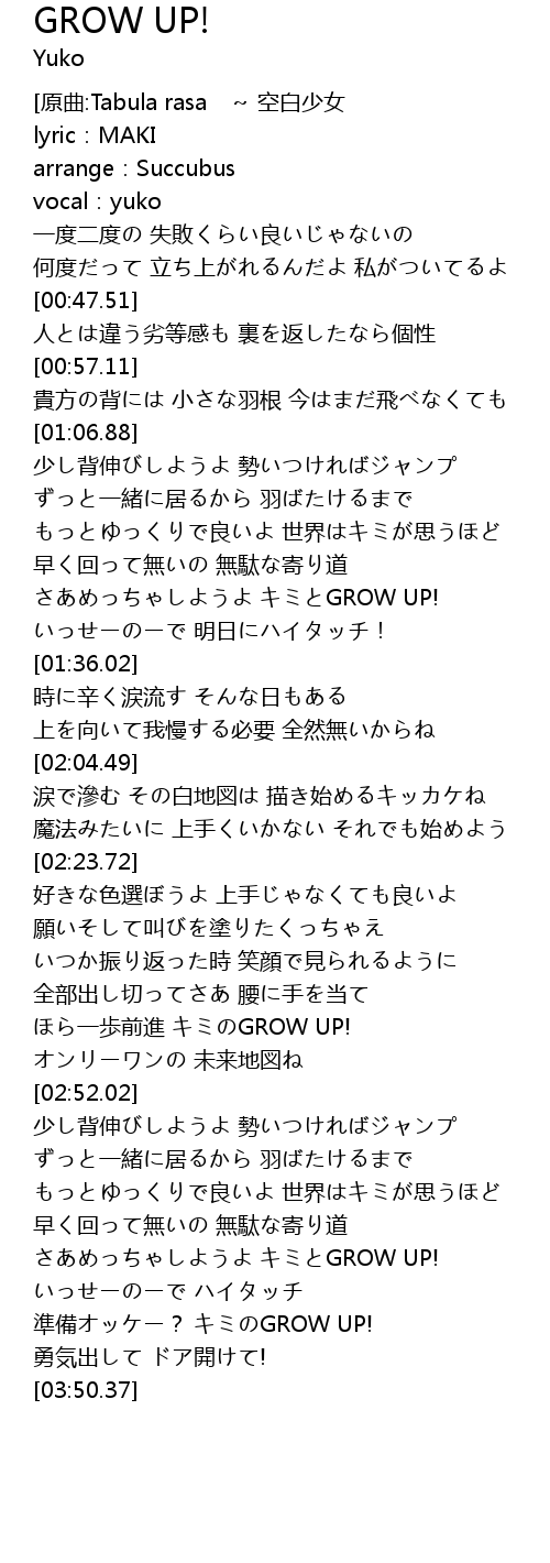 | [03:38.00] | さあめっちゃしようよ キミとGROW UP! |