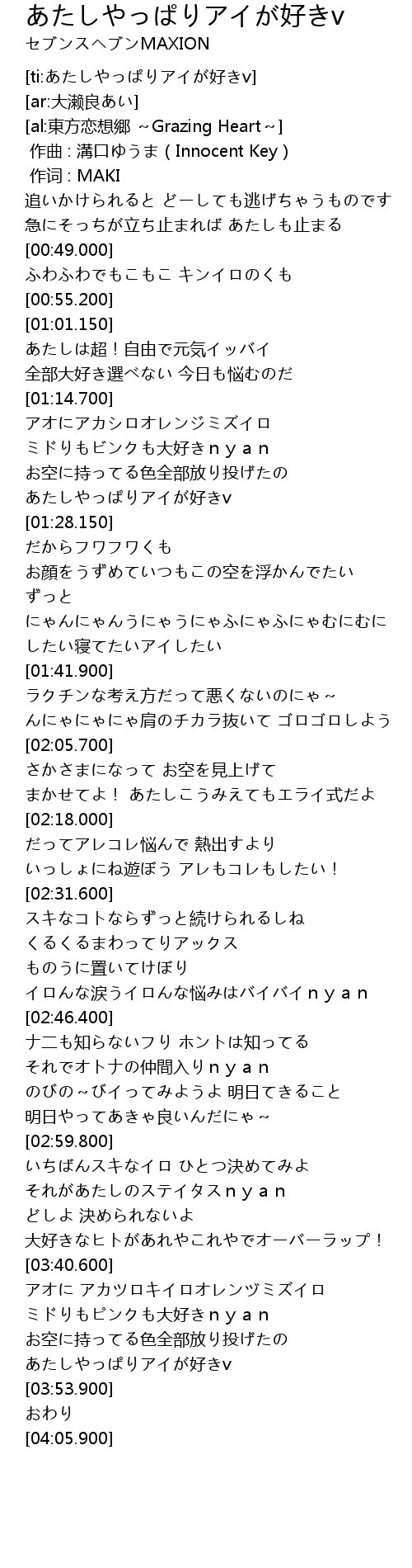 | [03:40.900] | アオに アカツロキイロオレンヅミズイロ ミドりもピンクも大好きnyan |