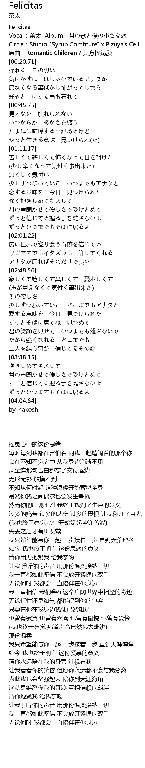 | [00:06.25] | Vocal:茶太 Album:君の歌と僕の小さな恋 |