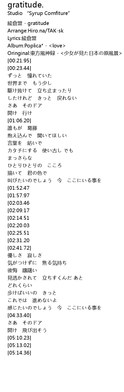 | [00:04.33] | Arrange:Hiro.na/TAK-sk |