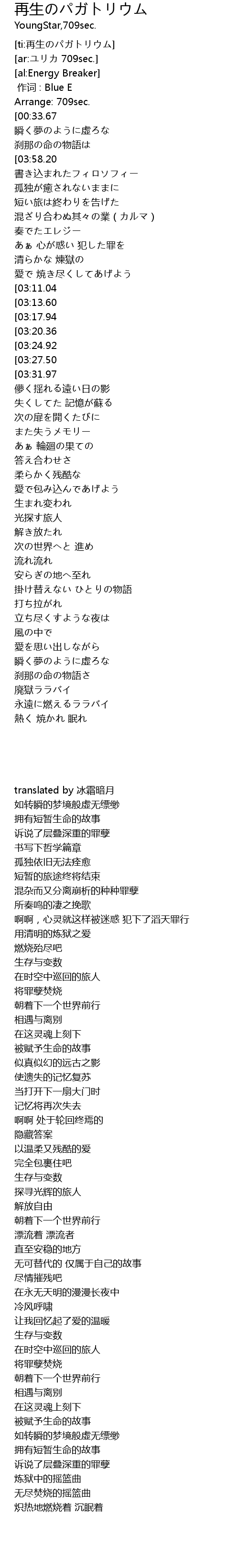 | [01:10.97][03:17.94] | 罪を焼かれ |