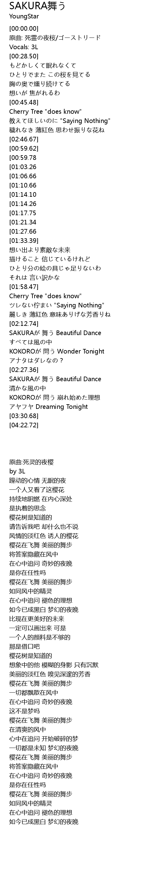 | [03:11.60][01:14.26] | SAKURA wu Beautiful Dance |