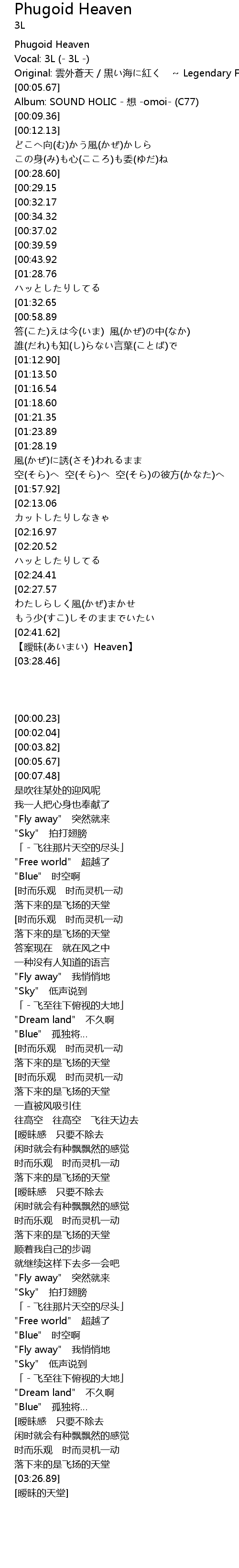 | [03:23.46][02:24.41][02:09.57] | là xià wǔ shàng Heaven |