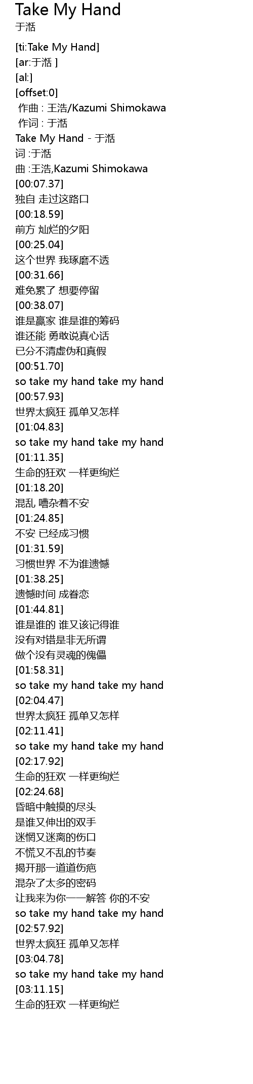 | [00:02.10] | Take My Hand - 于湉 |