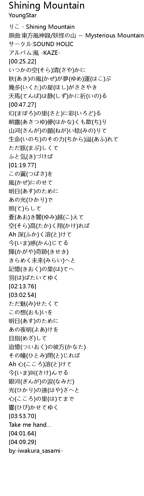 | [00:06.22] | 原曲:東方風神錄/妖怪の山 ~ Mysterious Mountain |