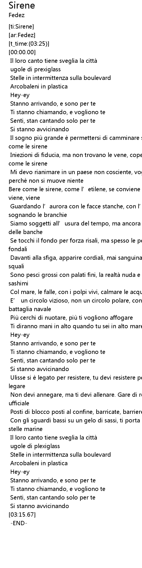 | [01:04.03] | Iniezioni di fiducia, ma non trovano le vene, coperte dalle squame, come le sirene |