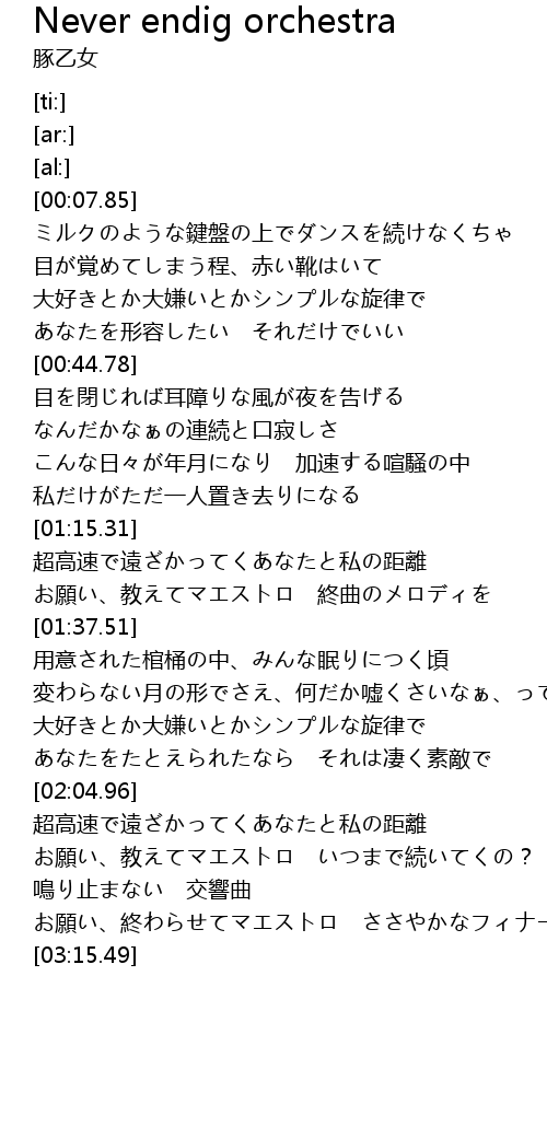 | [03:03.66] | お願い、終わらせてマエストロ ささやかなフィナーレで |
