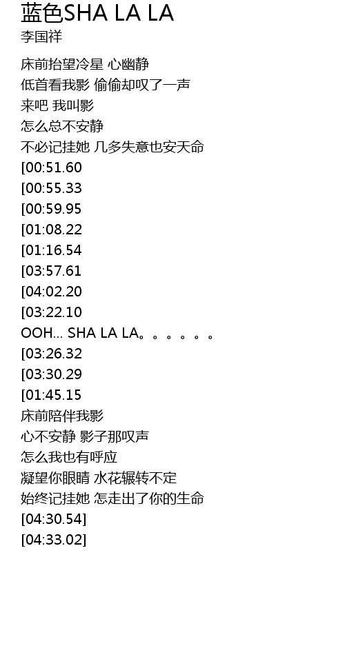 | [04:17.22][03:57.61][03:15.55][02:54.91][01:23.02] | OOH... SHA LA LA |