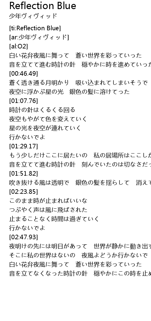 | [00:02.50] | 白い花弁夜風に舞って 蒼い世界を彩っていった |