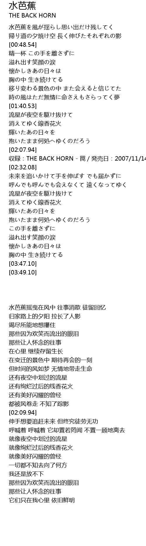 | [02:09.94] | shōu lù: THE BACK HORN mín fā mài rì: 2007 11 14 |