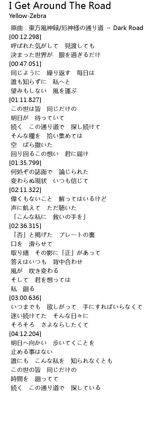 | [00:00.000] | 原曲:東方風神録/厄神様の通り道 ~ Dark Road |