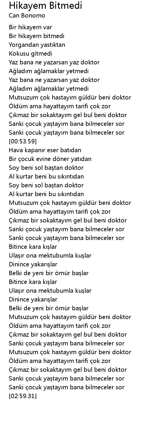 | [00:10.37] | Yaz bana ne yazarsan yaz doktor |