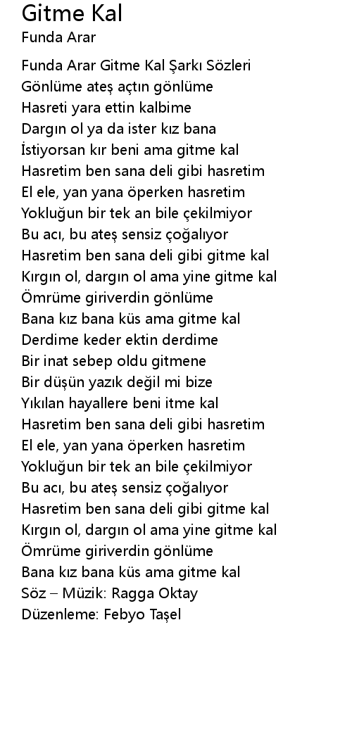 | Funda Arar Gitme Kal Şarkı Sözleri | |