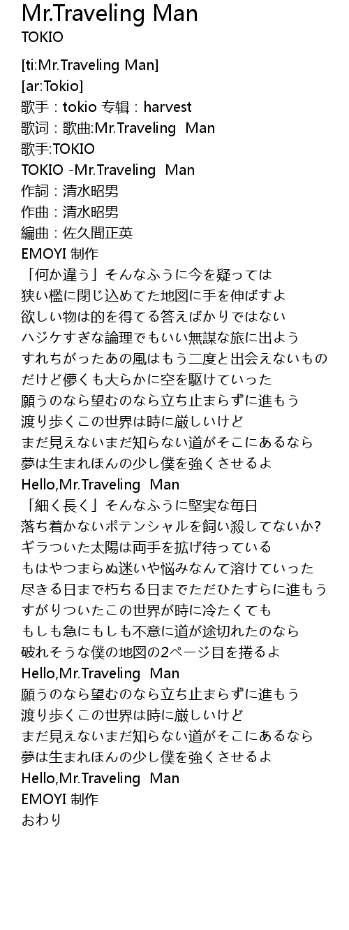 | [00:08.301] | TOKIO -Mr.Traveling Man |