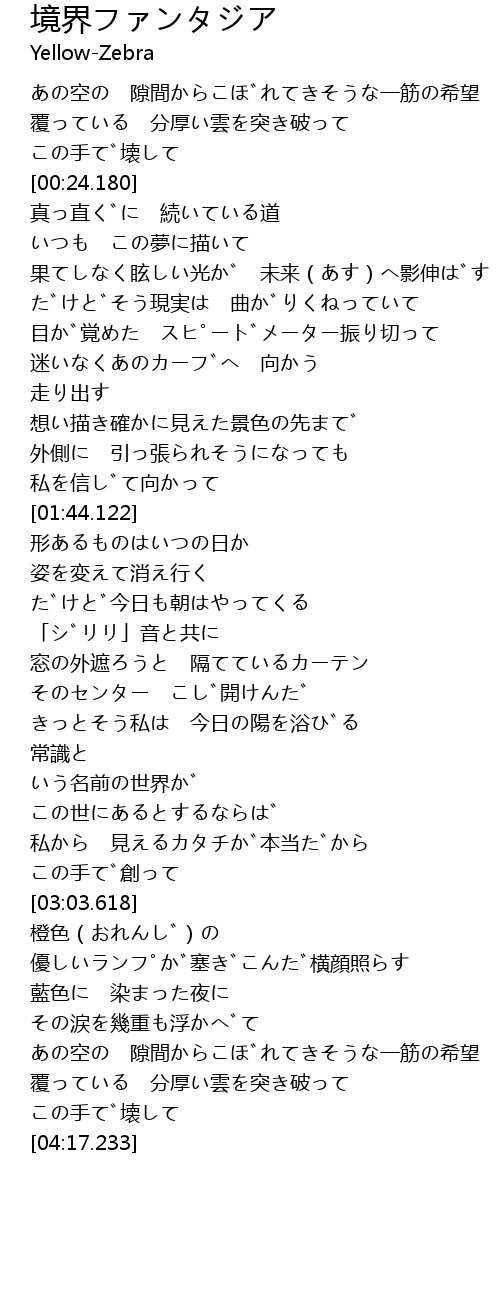 | [03:53.952] | あの空の 隙間からこぼれてきそうな一筋の希望 |