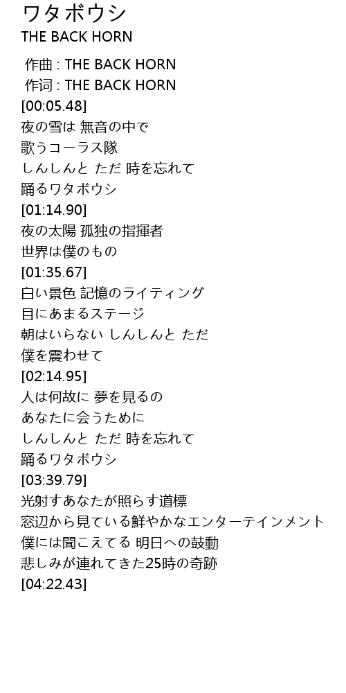 | [00:01.00] | 作词 : THE BACK HORN |