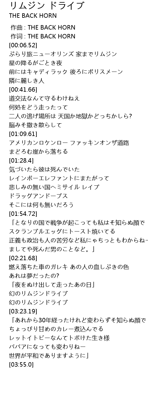 | [02:43.8] | 燃え落ちた車のガレキ あの人の血しぶきの色 |