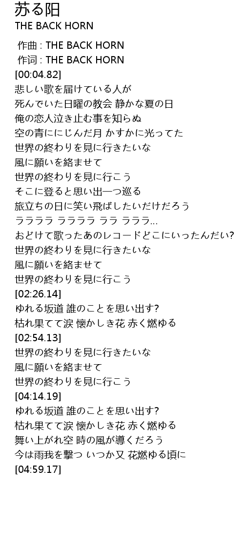 | [00:01.00] | zuò cí : THE BACK HORN |