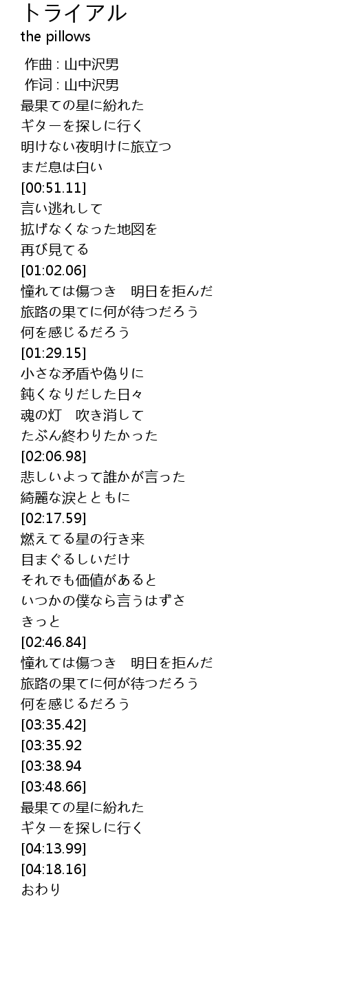 | [03:45.28][03:38.94] | 何度も抜け出したはずだ |